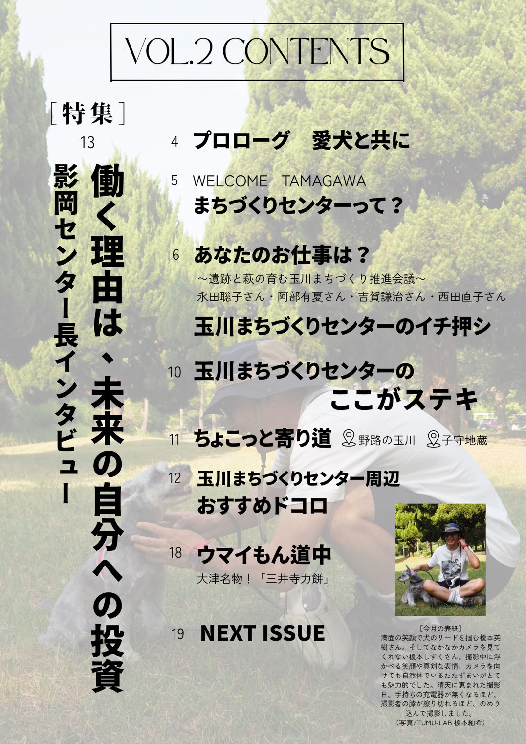 ◆プロローグ 愛犬と共に ◆まちづくりセンターって? ◆あなたのお仕事は? ◆玉川まちづくりセンターのイチ押し ◆玉川まちづくりセンターのここがステキ ◆特集 働く理由は『未来の自分への投資』センター長インタビュー ◆ちょこっと寄り道 ◆おすすめドコロ ◆ウマイもん道中 ◆NEXT ISSUE